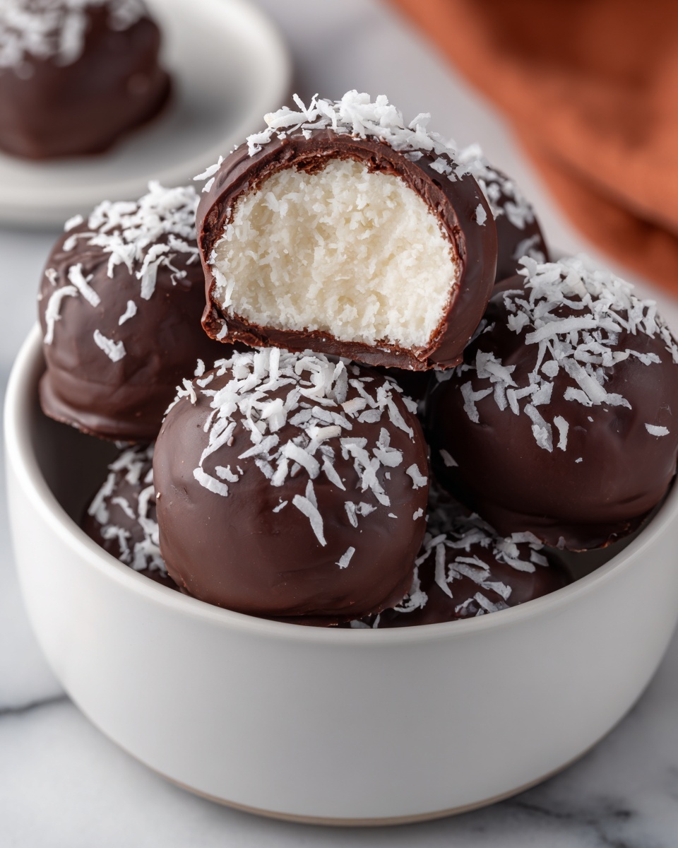 There’s no need to reheat these bites, as they are best enjoyed cold or at room temperature to maintain their chewy-coconut texture and crisp chocolate coating. However, if your chocolate shell softens too much, a quick chill in the fridge will bring back that perfect snap.