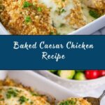 A delicious and easy Baked Caesar Chicken recipe featuring tender chicken breasts topped with creamy Caesar dressing, melted provolone cheese, and a buttery crouton crust baked to golden perfection.