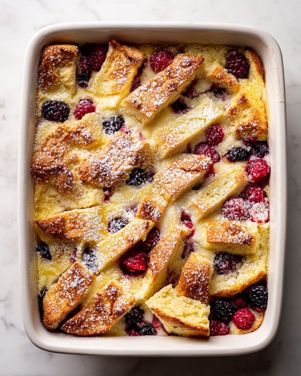 A luscious Berry Croissant Bake perfect for breakfast or brunch, featuring flaky croissant pieces soaked in a cinnamon-vanilla custard with fresh mixed berries, baked to golden perfection and lightly dusted with powdered sugar.