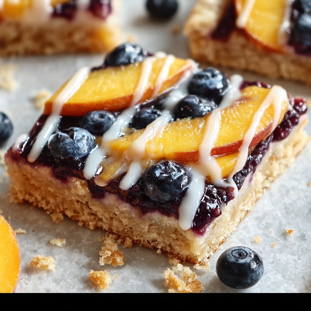 This Blueberry Peach Tart with Vanilla Glaze is a deliciously light and fruity dessert featuring a flaky puff pastry base topped with fresh peaches and blueberries, finished with a sweet vanilla glaze. Perfect for summer gatherings, this tart combines the natural sweetness of fruit with a crispy crust and a smooth glaze for a delightful treat.