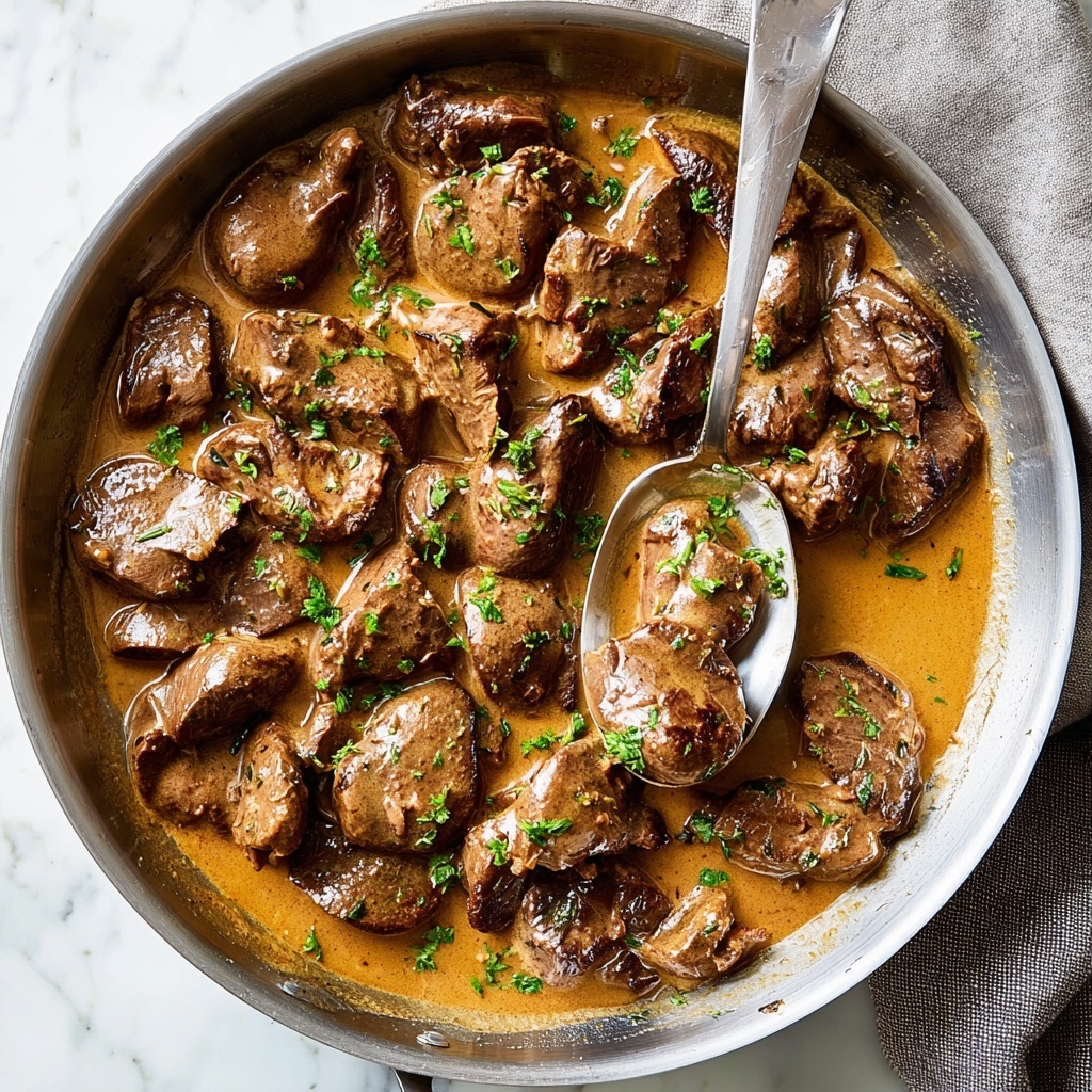 Pour in the white wine or chicken broth to deglaze the pan, scraping up all those delicious caramelized bits stuck at the bottom — that’s pure flavor gold. Reduce the heat, then stir in the heavy cream, allowing everything to simmer gently for 4 to 5 minutes. The sauce will thicken slightly and envelop the livers in its creamy embrace.