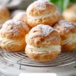 - Prepare the cream filling: While the puffs cool, beat the heavy cream with powdered sugar and vanilla extract until stiff peaks form, creating a sweet and light whipped cream filling.