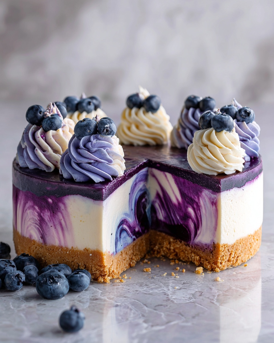 For a show-stopping presentation, serve individual slices plated with a drizzle of blueberry sauce and a dollop of whipped cream. Alternatively, layer small jars with cheesecake filling and blueberry swirls for charming parfaits — perfect for parties or elegant gatherings.