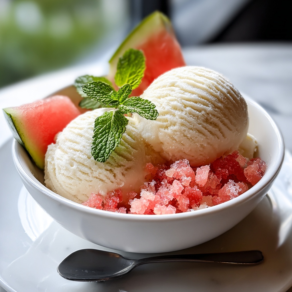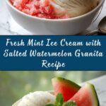 This refreshing dessert pairs creamy homemade fresh mint ice cream with a tangy salted watermelon granita, creating a perfect balance of cool, sweet, and slightly salty flavors ideal for summer.
