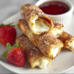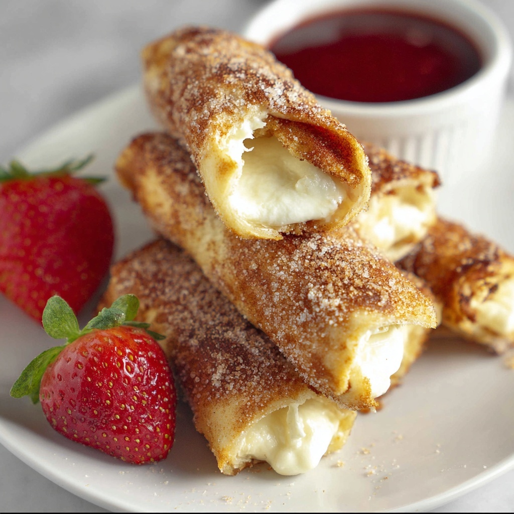 Delight in these crispy Fried Cheesecake Roll-Ups, featuring a creamy sweetened cream cheese filling wrapped in warm tortillas, fried golden, and finished with a buttery cinnamon sugar coating. Served with a luscious homemade strawberry sauce infused with a hint of vodka and lemon, these roll-ups make an irresistible dessert or snack perfect for gatherings and special occasions.