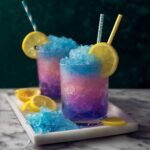 To build your galaxy in a glass, start by filling a tall glass about one-quarter full with regular crushed ice. Next, add an equal amount of your vibrant crushed magic ice to bring on the color magic. Pour in ¼ to ⅓ cup of your homemade lemon syrup, then top the glass gently with sparkling club soda for fizz and brightness. If you’re feeling festive, a splash of vodka or your preferred spirit adds an adult twist. Add a bit more crushed magic ice on top, and watch as the colors subtly shift and dance with every stir.
