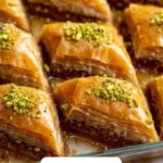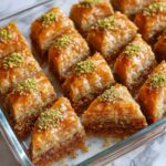 This traditional Greek Baklava recipe features layers of crisp phyllo dough filled with a fragrant mixture of walnuts and pistachios, spiced with cinnamon and cloves, and sweetened with a luscious honey syrup. Baked to golden perfection, this dessert offers a perfect balance of crunch, sweetness, and aromatic spices, making it a beloved Mediterranean treat.