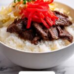 Finish off your Gyudon Japanese Beef Bowls Recipe with a sprinkle of thinly sliced scallions for a fresh crunch and a spoonful of red pickled ginger on top. The ginger’s tart brightness perfectly balances the dish’s savory-sweet depth, while the scallions add a pop of vibrant color and mild zest.
