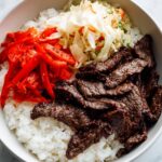 Finish off your Gyudon Japanese Beef Bowls Recipe with a sprinkle of thinly sliced scallions for a fresh crunch and a spoonful of red pickled ginger on top. The ginger’s tart brightness perfectly balances the dish’s savory-sweet depth, while the scallions add a pop of vibrant color and mild zest.