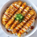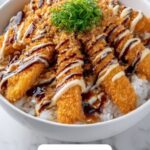 Japanese Katsu Bowls with Tonkatsu Sauce feature crispy fried chicken cutlets served over a bed of fluffy short-grain rice, topped with fresh shredded cabbage, julienned carrots, and a savory, tangy homemade tonkatsu sauce. This comforting and flavorful dish combines crunchy textures with sweet and umami notes, perfect for a satisfying main course.