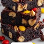 Delight in rich and decadent Monster Cookie Dough Brownies featuring a fudgy brownie base topped with a creamy, egg-free peanut butter cookie dough layer studded with oats, mini chocolate chips, and colorful mini M&M’s for a perfect balance of flavors and textures.