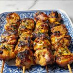 6. Bake the skewers: Bake in the preheated oven for 20–25 minutes, turning the skewers halfway through to ensure even cooking. The chicken should be cooked through and slightly browned at the edges, reaching an internal temperature of 165°F (74°C).