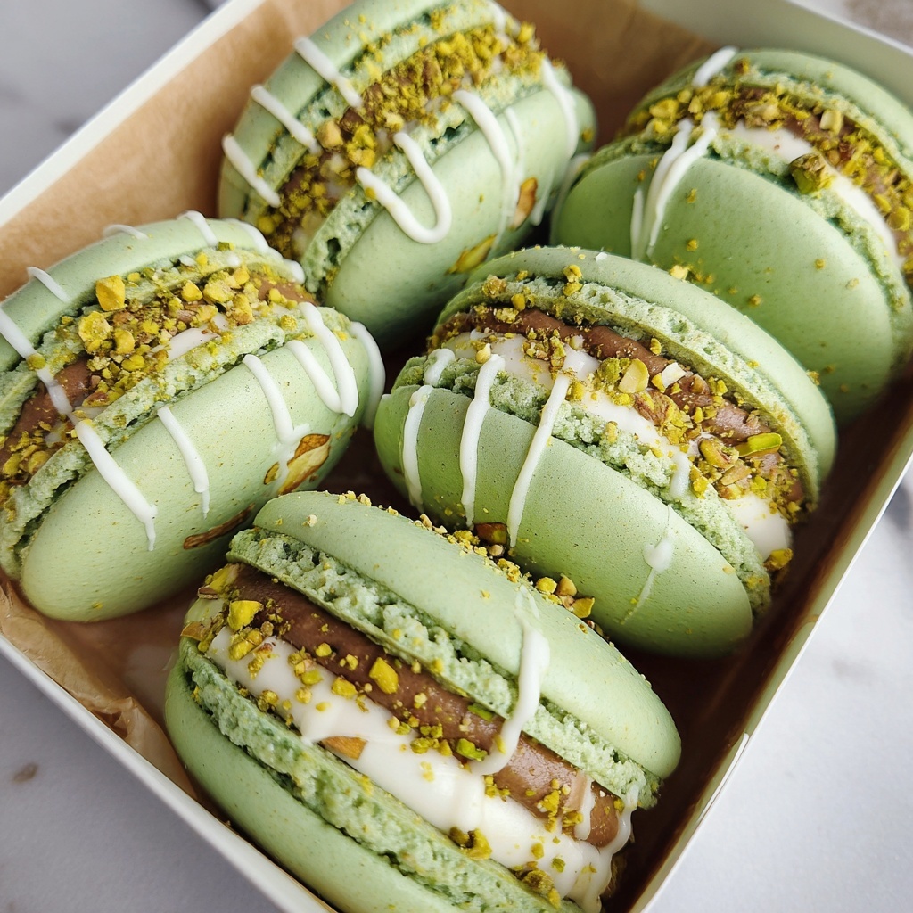 Delicate and elegant Pistachio Macarons featuring crispy almond and pistachio shells filled with a creamy pistachio buttercream. Perfect as a refined French dessert with nutty flavors and a beautiful green hue, ideal for special occasions or gourmet treats.