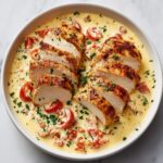 Return the cooked chicken breasts to the skillet, nestling them into the luscious sauce. Let everything cook together on low heat for about 5 minutes so the chicken can soak up the sauce’s complex flavors. Before serving, sprinkle chopped fresh parsley or cilantro over the top to add a fresh and vibrant touch of green.