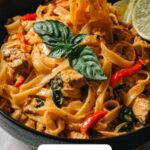 - Combine and Serve: Remove the skillet from heat. Add the cooked noodles and prepared peanut sauce to the skillet, tossing everything together to coat the noodles evenly. Garnish with fresh basil leaves and serve with lime wedges and optional crushed peanuts for added crunch.