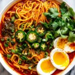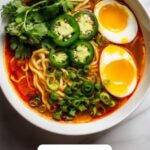 - Serve: Divide the noodles and broth into serving bowls. Top each bowl with halved soft-boiled eggs, sliced green onions, and a sprinkle of chili flakes and sesame seeds for extra heat and texture. Serve immediately while hot.