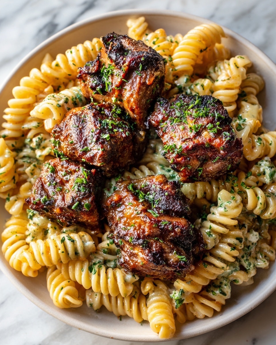 Arrange the cheesy rotini on plates with a generous handful of those mouthwatering steak bites on top or on the side. Garnish with chopped parsley and a sprinkle of chili flakes if you like that little touch of heat. Serve immediately for a warm, comforting dish that’s guaranteed to please.